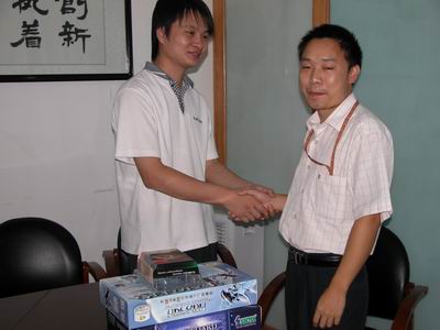 2004年9月27日,也是中秋的前夕,百年奧運競猜活動的重磅人物--特等獎得主曹而先生終于亮相商科集團,領走了他的頭等大獎(碩泰克K8+銘瑄5700ultra+AMD Athlon64 3000+cpu)一共價值現金5000元。
