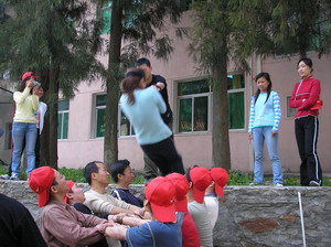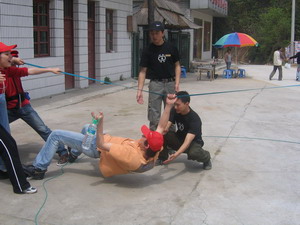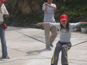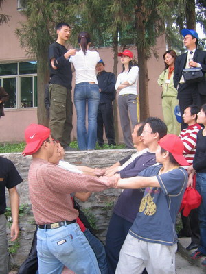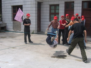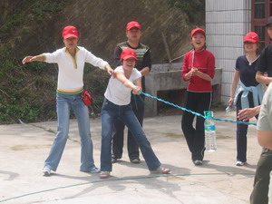 雷陣取水(在一個(gè)直徑4米的地面中間有一個(gè)裝滿水的杯子(作為假設(shè)的地雷),我們有的工具就是繩子和人,并且繩子和人都不能接觸圈內(nèi)的地面的情況下取出杯子,而且滴水不能灑。想一想可能嗎?當(dāng)然可以,團(tuán)隊(duì)的智慧和潛力是不可估量的。我們?cè)?分鐘的時(shí)間里做出了8種方案,利害吧:)