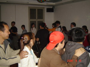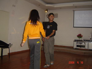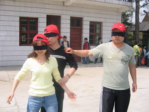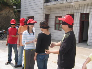 盲人摸號(hào)(每隊(duì)選出9個(gè)成員均戴上眼罩,每人一個(gè)號(hào),此號(hào)只有本人知道。小組成員在“全盲全啞”狀態(tài)下,根據(jù)每人的號(hào)數(shù),按從小到大的順序排列出一條直線。全盲全啞?那怎么溝通呀?聽(tīng)起來(lái)有點(diǎn)兒難度哦,但武漢商科人果然聰明,雖然中間出了一點(diǎn)兒小差曲(有人差點(diǎn)兒偏離隊(duì)伍),但兩個(gè)隊(duì)均在7分鐘和8分鐘內(nèi)準(zhǔn)確的排列出順序,是一點(diǎn)兒不差哦。教官都說(shuō)我們的成績(jī)是相當(dāng)不錯(cuò)呀。唉,不得不佩服我們自己呀。^-^)