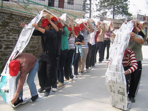 鐵甲戰(zhàn)車(記得坦克是怎么前行的嗎?軸帶動(dòng)履帶向前進(jìn)。教官“丟”給我們每個(gè)隊(duì)一小疊報(bào)紙和一小圈透明膠。有限的資源,50米的距離,報(bào)紙為“履帶”,人為“滾軸”, 我們要前行啦!)