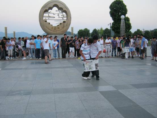 “兩人一腳”,一邊賣力的向前進,一邊還要保護報紙不能有破損。瞧這“兩兄弟”感情多好,不斷引來陣陣笑聲。