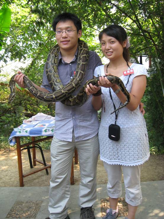 來蛇島當然要和蛇島的主角合影嘍!瞧我們的美女和帥哥,摟著大蟒蛇一點也不怕。