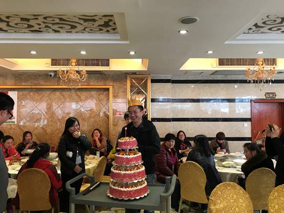 返程當天,恰逢是商科集團總經理孫總的生日,午飯期間,大伙們悄悄準備了生日蛋糕和小禮物,并送上生日歌和美好的祝福,現場歡聲不斷,連旁邊桌的朋友們都忍不住放下手上的美味,共同為孫總慶賀生日。