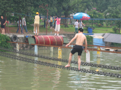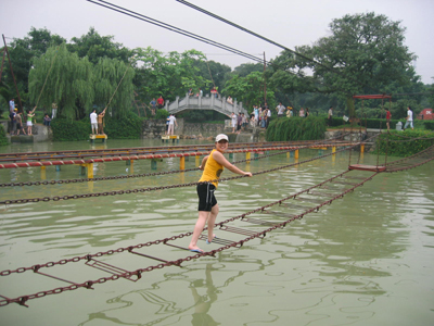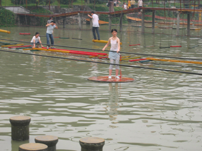 有個“仙女”居然雙腳“離水”三尺,踩著繩梯悠閑自得的走來走去。