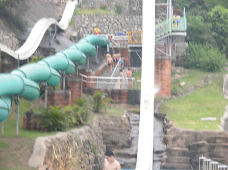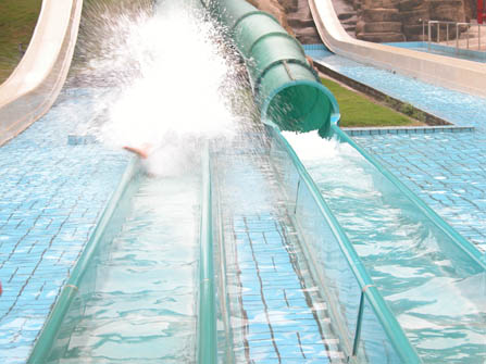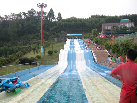 據不可靠的資料記載,此滑水道有七層樓那么高,也就是大概在25米左右,最高出和接地處據本人不完全的統計是成110度角,當你站到最頂點的高臺上的時候,要往下滑的的時候需具有大智大勇的氣魄; 大智,站在上面的時候,千萬的不要往下看看有多高,不然就肯定把你滑下去的決心減低到百分零點幾。(呵呵,說得有點夸張了,別給我嚇到),大勇,其實就是懵懵懂懂的沖下去,根本就不知道自己干了些什么之類的。