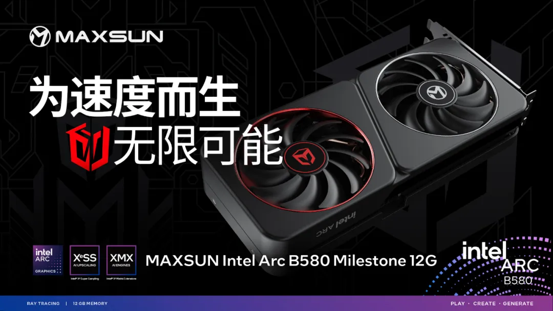 MAXSUN Intel Arc B580 Milestone 12G顯卡,為速度而生,無論是性能、散熱、外觀上都有著出色表現(xiàn)。12GB超大顯存,即使在高負(fù)載游戲中都能輕松應(yīng)對。