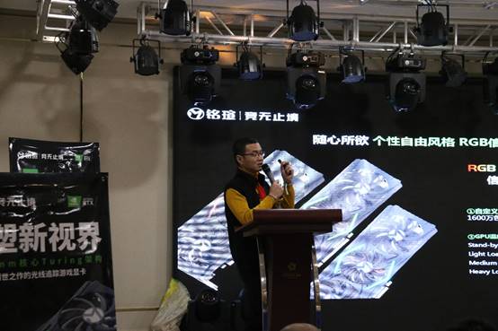 會議現場,展示了系列顯卡,新一代搭載英偉達圖靈架構的RTX 20系列顯卡,具有第四代太極陰陽散熱系統、RGB燈效、定制背板、全新太極扇葉等多項功能,保證玩家在享受游戲刺激時仍然保持顯卡溫度低狀態,滿足高端網吧的業務需求。現場的小伙伴們也迫不及待地進行了體驗。