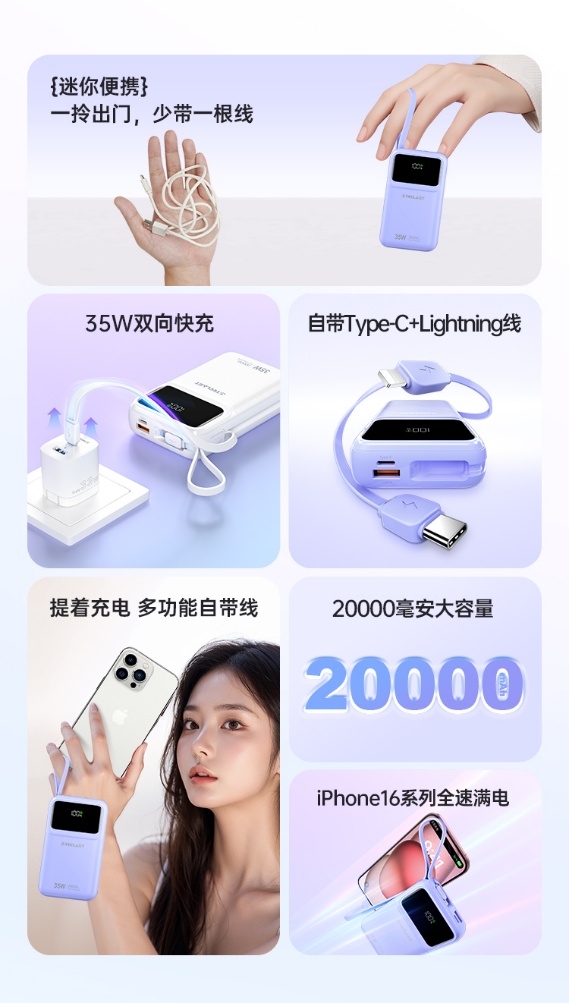 除了容量和快充功能,臺電 Teclast Q20 Pro 還自帶了一條 Type-C 線和一條 Lightning 線,適用于蘋果 iPhone 6~16 以及安卓設(shè)備。這意味著你無需再為不同設(shè)備準(zhǔn)備不同的充電線,就可以為你的所有設(shè)備充電,數(shù)字顯示屏也是這款移動電源的一個實(shí)用功能。你可以隨時查看剩余電量,了解移動電源的使用情況,避免在關(guān)鍵時刻出現(xiàn)電量不足的情況。