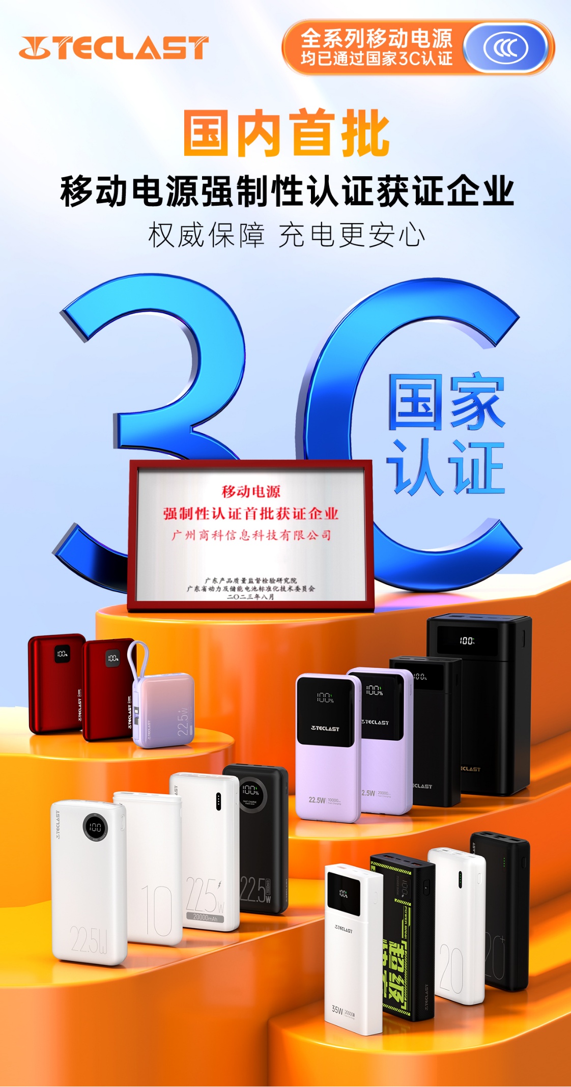 作為知名的3C數碼品牌,始終將產品質量和用戶安全放在首位。此次全系列移動電源產品通過3C認證,不僅是對臺電Teclast充電寶安全性和可靠性的肯定,更是品牌對消費者負責的體現。通過3C認證的產品,需經過嚴格的安全性能測試、電磁兼容性測試以及能效標準評估,確保產品在使用過程中安全可靠。