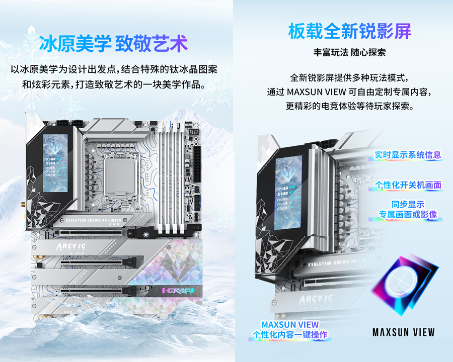 而要讓這顆 “強(qiáng)芯” 充分釋放潛能,離不開一塊實(shí)力與顏值兼?zhèn)涞闹靼?—— 銘瑄 iCraft Z890 Arctic 正是這樣的存在。這款主板作為iCraft系列的高端型號(hào),以 “北冰洋” 為設(shè)計(jì)靈感,采用冰原美學(xué)設(shè)計(jì)。特殊的鈦冰晶圖案搭配炫彩元素,整體色調(diào)統(tǒng)一且富有質(zhì)感,擺在機(jī)箱中宛如一件冰雕藝術(shù)品,完美適配當(dāng)下流行的白色主機(jī)風(fēng)格,與《戰(zhàn)地 6》的冰雪戰(zhàn)場(chǎng)形成奇妙呼應(yīng)。