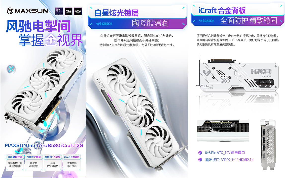 如果說主板是戰(zhàn)場(chǎng)“調(diào)度中心”,那MAXSUN Intel Arc B580 iCraft 12G顯卡就是還原《戰(zhàn)地6》戰(zhàn)場(chǎng)質(zhì)感的“光影畫師”,而且還是位“顏值派畫師”。 白晝炫光白涂層覆蓋的顯卡主體,搭配簡(jiǎn)約幾何線條修飾的合金背板,與Z890 Arctic主板放在一起堪稱“白月光組合”,顏值拉滿。