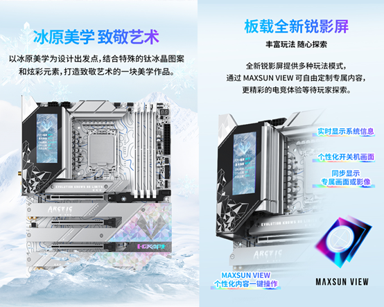首先是銘瑄 iCraft Z890 Arctic主板,作為iCraft系列的高端型號,以 “北冰洋” 為設計靈感,采用冰原美學設計。特殊的鈦冰晶圖案搭配炫彩元素,整體色調統一且富有質感,擺在機箱中宛如一件冰雕藝術品,完美適配當下流行的白色主機風格,與《戰地 6》的冰雪戰場形成奇妙呼應。板載的全新銳影LED屏,不僅支持RGB光效同步,還能實時顯示CPU溫度、內存頻率、供電狀態等核心參數,更有多種玩法模式可選。這讓你在激戰《戰地 6》時,無需頻繁切換監控軟件打斷游戲,就能直觀掌握硬件運行情況,實用性與觀賞性拉滿。