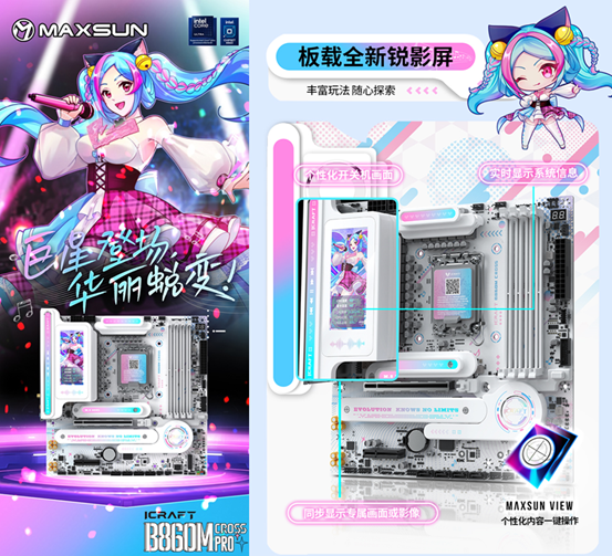 然后是銘瑄iCraft B860M CROSS PRO主板,作為顏值旗艦,全覆蓋著藍粉漸變的二次元紋路,每一處細節都透著精致感。吸睛亮點莫過于全新配備的3.4英寸銳影LED顯示屏,不僅能實時顯示CPU溫度、內存頻率等系統信息,還能自定義開關機畫面,甚至支持桌面映射,同步展示專屬壁紙或游戲畫面。搭配配套軟件MAXSUN View,玩家可以盡情解鎖無限自定義玩法,讓主板成為主機的 “個性門面”。