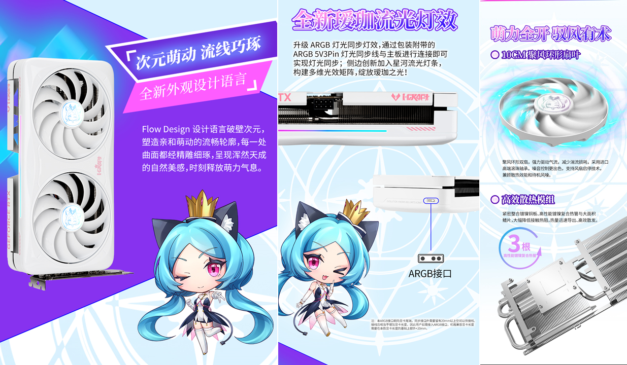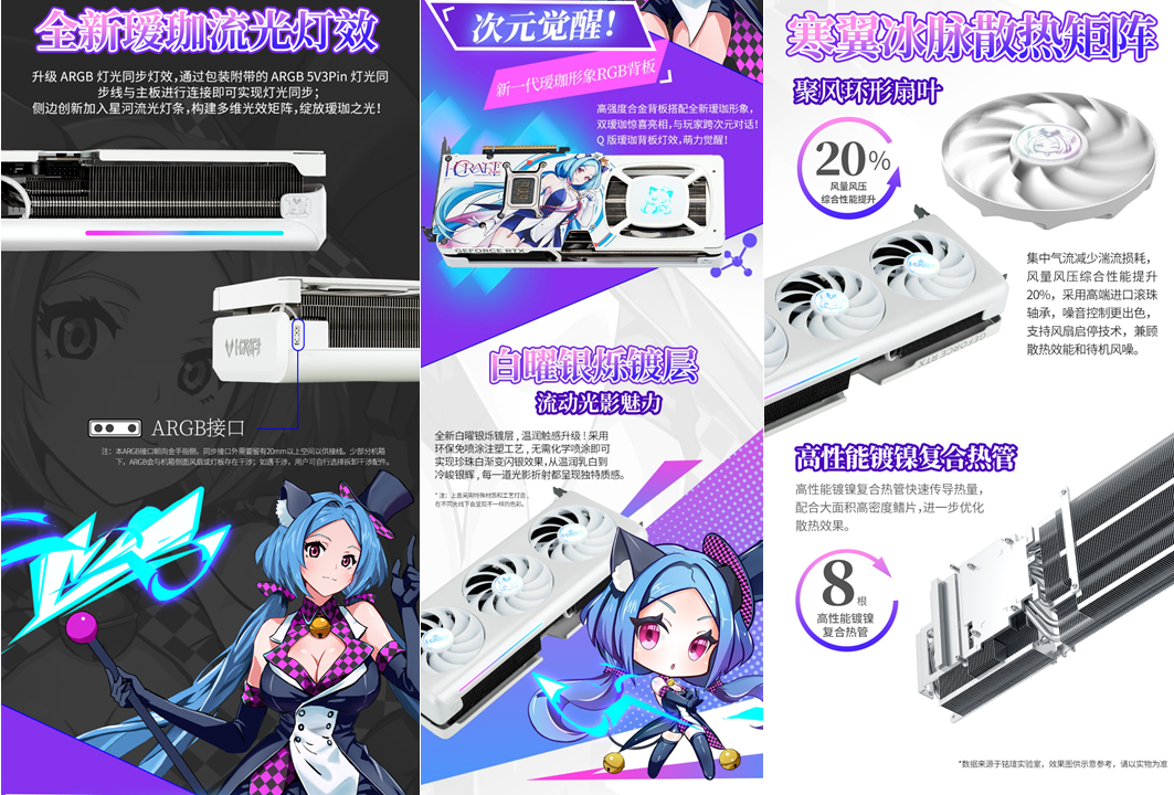 銘瑄GeForce RTX 5080 iCraft OC16G璦珈顯卡,升級 ARGB 燈光同步燈效,通過包裝附帶的ARGB 5V3Pin 燈光同步線與主板進行連接即可實現(xiàn)燈光同步;側(cè)邊創(chuàng)新加入星河流光燈條,構(gòu)建多維光效矩陣,綻放璦珈之光! 高強度合金背板搭配全新璦珈形象,雙璦珈驚喜亮相,與玩家跨次元對話!Q版璦珈背板燈效,萌力覺醒! 性能上,依托Blackwell 架構(gòu)滿血核心與 16GB GDDR7 顯存,運行《戰(zhàn)地 6》4K 高畫質(zhì)并開啟光線追蹤與 DLSS 4 超分辨率模式時,遠景植被、遠處建筑紋理清晰可見,夜間作戰(zhàn)時的手電筒光斑、爆炸火光等動態(tài)光影效果無拖影;支持 NVIDIA Reflex 低延遲技術,鼠標操作響應速度提升顯著,近距離剛槍時瞄準更準確,再也不會因延遲錯失爆頭機會,助你在跨年戰(zhàn)場中所向披靡。