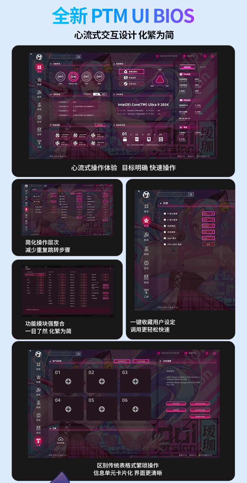 銘瑄iCraft B860M CROSS PRO璦珈主板,作為顏值旗艦,全面支持銘瑄全新的PTM UI BIOS,操作更便捷。吸睛亮點則是充滿細節(jié)的個性化屏幕,全新配備銘瑄銳影屏,3.4英寸銳影LED顯示屏支持多種模式設置,除了可實時顯示系統(tǒng)信息、個性化開關機畫面外,還可開啟桌面映射,同步顯示專屬畫面或影像,通過銳影屏配套軟件MAXSUN View,探索無限自定義玩法。全面支持銘瑄全新的PTM UI BIOS,性能實力自然也是高水平,供電升級,采用16+1+1相供電設計,核心供電50A Dr.Mos,輕松駕馭英特爾® 酷睿™ Ultra 9 處理器 285K;配備前后置雙USB-C®,后置USB4® 40G接口,支持最高40Gbps傳輸速率,數(shù)據(jù)傳輸更高速。