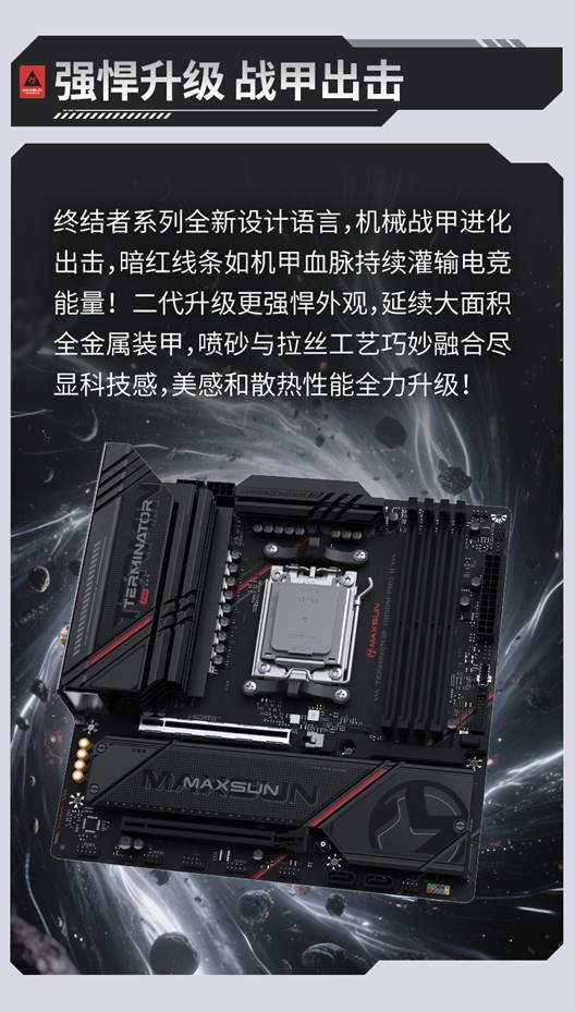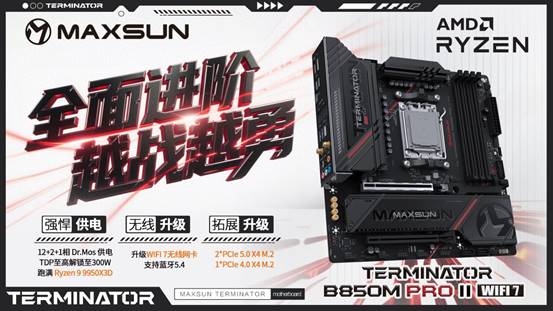 自銘瑄終結者B850M PRO系列主板推出以來一直廣受好評,此次終結者 PRO再度進化,推出二代新品MS-Terminator B850M PRO II WIFI7,從外觀、拓展到網絡實現多方位戰力升級,以更硬核的配置,為玩家打造新一代高性價比裝機利器。