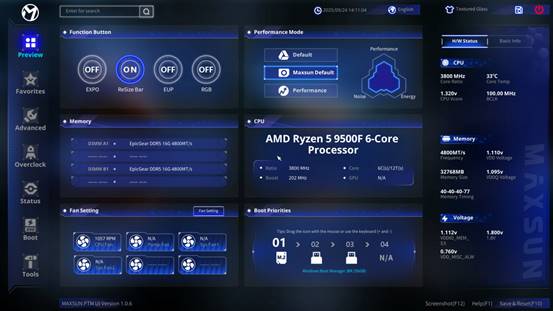 MS-Terminator B850M PRO II WIFI7 原生搭載了銘瑄全新的PTM UI BIOS。這款BIOS打破了傳統操作門檻,借鑒手機APP的交互邏輯,采用PTM設計理念(PC To Mobile),將所有功能模塊化后再進行聚焦式設計,讓所有交互層級不超過2層,手機端的卡片式體驗界面,讓用戶輕松、直觀、簡單進行個性化設置。無論新手還是資深玩家,都能輕松上手,快速調校出更佳的系統狀態。