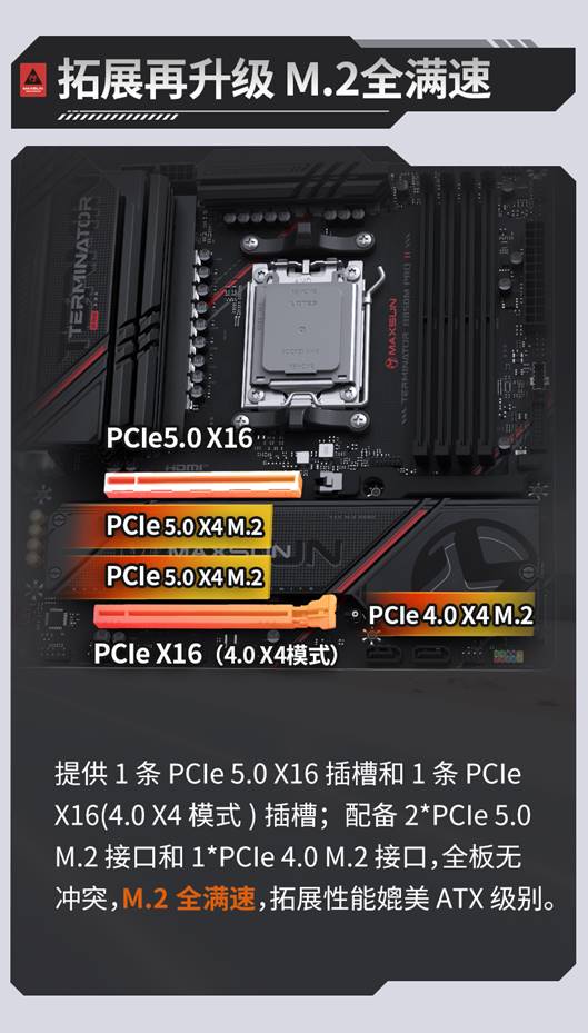 相對比一代,二代新品主板在拓展和網絡方面都進行了升級。拓展方面,主板提供2個 PCIe 5.0 X4 M.2接口和1個 PCIe 4.0 X4 M.2接口,全部支持NVMe協議,M.2全滿速!同時還配備1條PCIe 5.0 X16插槽(位于第一槽位,對小尺寸機箱安裝更友好)和1條PCIe X16(4.0 X4模式)插槽,全板無沖突,拓展性能媲美ATX級別。