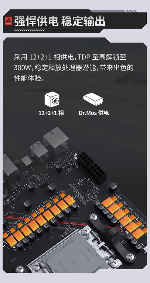 強勁性能離不開穩定供電的保障。MS-Terminator B850M PRO II WIFI7 采用 12+2+1 相 Dr.Mos 供電設計,搭配優質元器件,TDP支持至高解鎖至300W。即使面對 AMD Ryzen™ 9 9950X3D等高性能處理器,也能提供持續穩定的電力輸出,充分釋放CPU潛能,拒絕性能瓶頸。