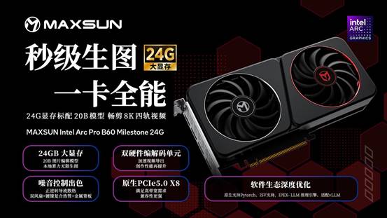 無論是追求秒級(jí)生圖、流暢剪輯的內(nèi)容創(chuàng)作者,還是追求更強(qiáng)悍AI性能、需要搭建多卡同步運(yùn)算環(huán)境的高階算力用戶,銘瑄 Intel Arc Pro B60系列顯卡都提供了值得信賴的解決方案。24G版本的MAXSUN Intel Arc Pro B60 Milestone 24G顯卡以高性價(jià)比助力靈感實(shí)時(shí)落地,雙GPU 48G版本的MAXSUN Intel Arc Pro B60 Dual 48G Turbo則以雙芯充沛算力勝任更高階的AI推理與開發(fā)任務(wù)。想要體驗(yàn)全新流暢創(chuàng)作之旅,或構(gòu)建本地AI算力平臺(tái)的用戶,歡迎前往銘瑄京東自營(yíng)旗艦店了解更多詳情與選購(gòu)!