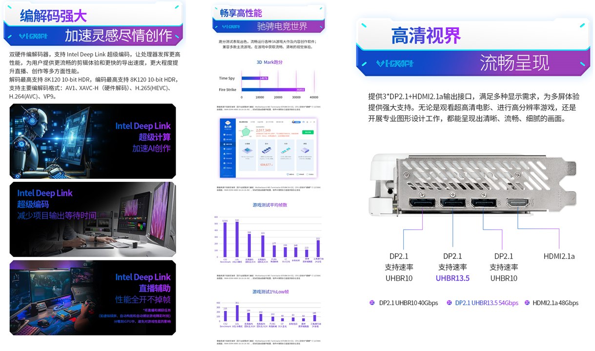 MAXSUN Intel Arc B580 iCraft 12G 顯卡不僅是游戲利器,更是兼顧多場景需求的全能選手。接口方面,提供3個DP2.1和1個HDMI2.1a輸出接口,多屏體驗、高清視覺盡在掌握。此外,它的編解碼能力也十分卓越,雙硬件編解碼器支持AV1、H265和H264等主流編解碼格式,還支持了HAVC-H解碼,不僅能為游戲直播提供清晰流暢的畫面輸出,更能為專業(yè)攝影剪輯帶來高效體驗,兼顧游戲與創(chuàng)作雙重需求。