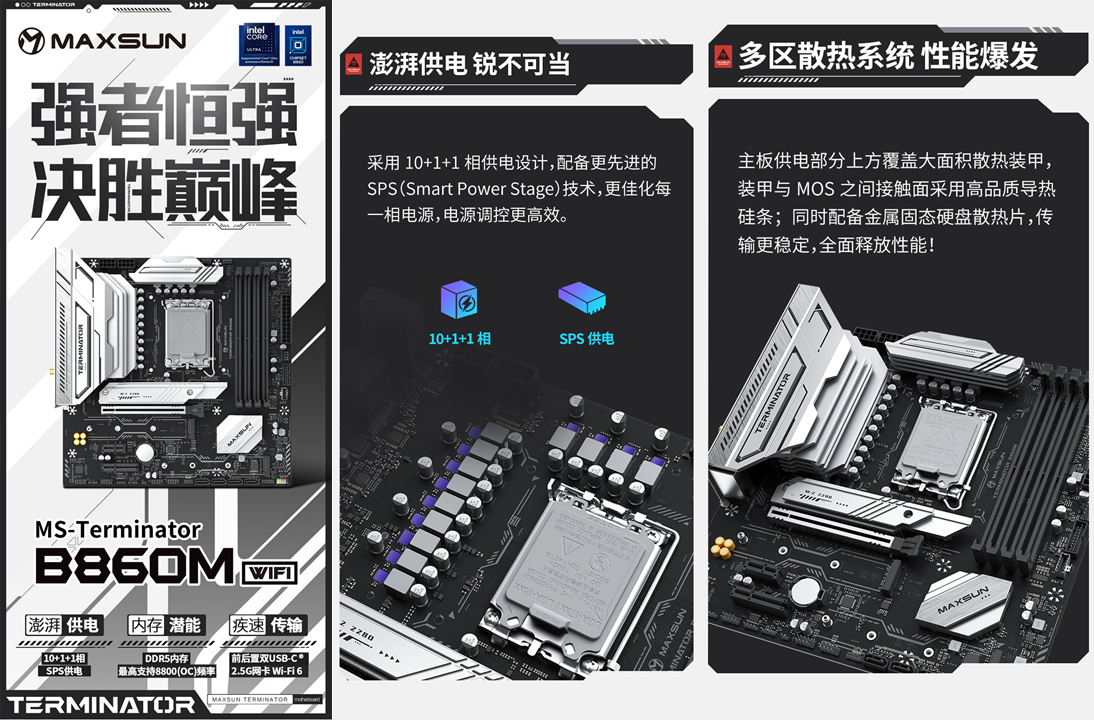 好馬配好鞍,想要充分釋放處理器的性能,一塊適配且性能強悍的主板必不可少。銘瑄Terminator B860M WIFI主板采用Micro-ATX板型,外觀上延續(xù)了終結(jié)者系列的經(jīng)典撞色設(shè)計,黑色PCB搭配銀白色散熱裝甲,低調(diào)中透著滿滿的科技感,質(zhì)感十足。供電方面這款主板也是誠意滿滿,采用了10+1+1 相 SPS 供電設(shè)計,配備更先進的 SPS(Smart Power Stage)技術(shù),更佳化每一相電源,使得電源調(diào)控更加高效穩(wěn)定,穩(wěn)定支持英特爾酷睿 Ultra 5 225F 處理器。即使處理器處于滿負載運行狀態(tài),也能持續(xù)輸出穩(wěn)定電力,避免卡頓掉幀等問題。為了讓供電系統(tǒng)時刻保持冷靜,主板供電部分上方覆蓋大面積散熱裝甲,裝甲與 MOS之間接觸面采用高品質(zhì)導(dǎo)熱硅條,能快速傳導(dǎo)并散發(fā)運行時產(chǎn)生的熱量;同時還配備金屬固態(tài)硬盤散熱片, 讓硬件性能全面釋放,傳輸更穩(wěn)定。