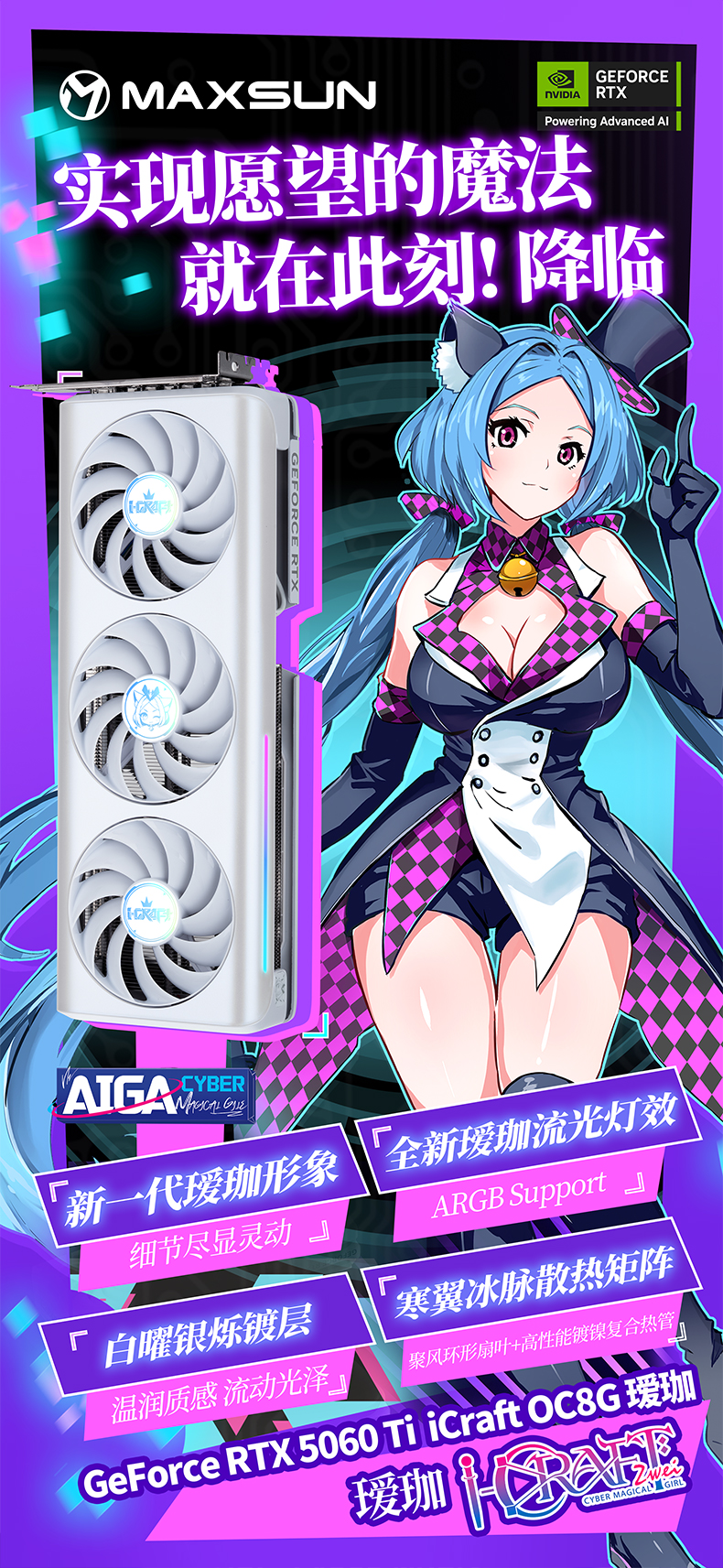 不僅性能能打,銘瑄GeForce RTX 5060 Ti iCraft OC8G 璦珈顯卡的顏值更是戳中玩家審美。全新白曜銀爍鍍層,溫潤觸感升級,采用環(huán)保免噴涂注塑工藝,無需化學噴涂就能呈現(xiàn)珍珠白漸變閃銀效果,從溫潤乳白到冷峻銀輝,每一道光影折射都獨具質感。搭配側邊創(chuàng)新加入的星河流光燈條,構建出多維光效矩陣,配合升級的 ARGB 燈光同步功能,只需通過包裝附帶的 ARGB 5V 3Pin 燈光同步線與主板連接,就能實現(xiàn)燈光聯(lián)動,讓主機機箱瞬間變身 "次元舞臺"。高強度合金背板暗藏巧思,全新Q版璦珈形象萌趣十足,與正面白調形成呼應,個性化拉滿。