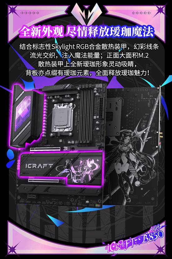 銘瑄iCraft B850 AIGA主板在設計上富有巧思,將二次元美學與硬核硬件完美融合,標志性的“璦珈”IP元素貫穿始終,自帶超高視覺辨識度,戳中年輕學生黨的審美偏好。標志性的 Skylight RGB 合金散熱裝甲,凌厲的金屬質感之上,幻彩 RGB 線條如流光般交織流轉,仿佛注入了靈動的魔法能量,隨呼吸燈效變幻出萬千色彩,為機箱內部營造出沉浸感的光影氛圍。主板正面大面積的 M.2 散熱裝甲上,全新設計的璦珈形象靈動吸睛,背板處也巧妙點綴著同款元素,從正面到背面,每一處細節都在釋放獨特的 “璦珈魔法”,讓二次元愛好者一眼淪陷。