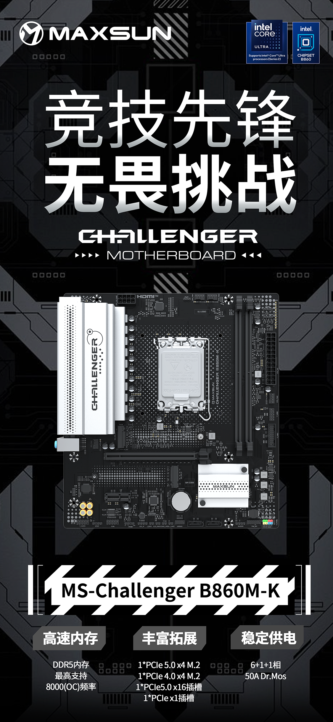 MS-Challenger B860M-K 則為入門用戶帶來高性價比之選,提供6+1+1相50A Dr.Mos穩(wěn)定供電,2*M.2滿速接口,2*PCIe拓展插槽以及多達(dá)10個USB口,其中包括6個USB 5G接口,功能齊全實(shí)用,日常辦公與輕度電競都能輕松應(yīng)對。