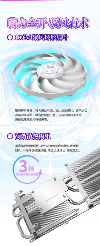 這款顯卡配備了10CM聚風(fēng)環(huán)形扇葉,能集中氣流減少湍流損耗,采用進(jìn)口高端滾珠軸承,噪音控制更出色,還支持風(fēng)扇啟停技術(shù),兼顧散熱效能和待機(jī)風(fēng)噪。高效散熱模組緊密整合鍍鎳銅板、高性能鍍鎳復(fù)合熱管與大面積鰭片,大幅降低接觸熱阻,讓熱量迅速導(dǎo)出、高效散發(fā),為穩(wěn)定運(yùn)行保駕護(hù)航。