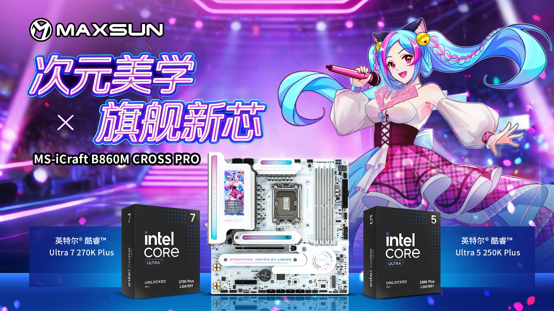 英特爾® 酷睿™ Ultra 200S Plus 系列處理器將于本周四 3 月 26 日重磅開售,酷睿 Ultra 7 270K Plus 與酷睿 Ultra 5 250K Plus 兩大旗艦型號攜架構深度優化與核心規格全面升級而來,為玩家打造了更強性能體驗與突破性綜合價值。而銘瑄 iCraft B860M CROSS PRO主板,以二次元的高顏值設計和旗艦級的硬件規格,完美適配新處理器的性能需求,不僅能充分釋放酷睿 Ultra 200S Plus系列處理器的潛能,更以高性價比和個性化設計,成為打造個性化白色主機玩家的不二之選。新芯開售之際,二者強強聯手,為玩家解鎖顏值與性能雙滿配的全新硬件體驗!