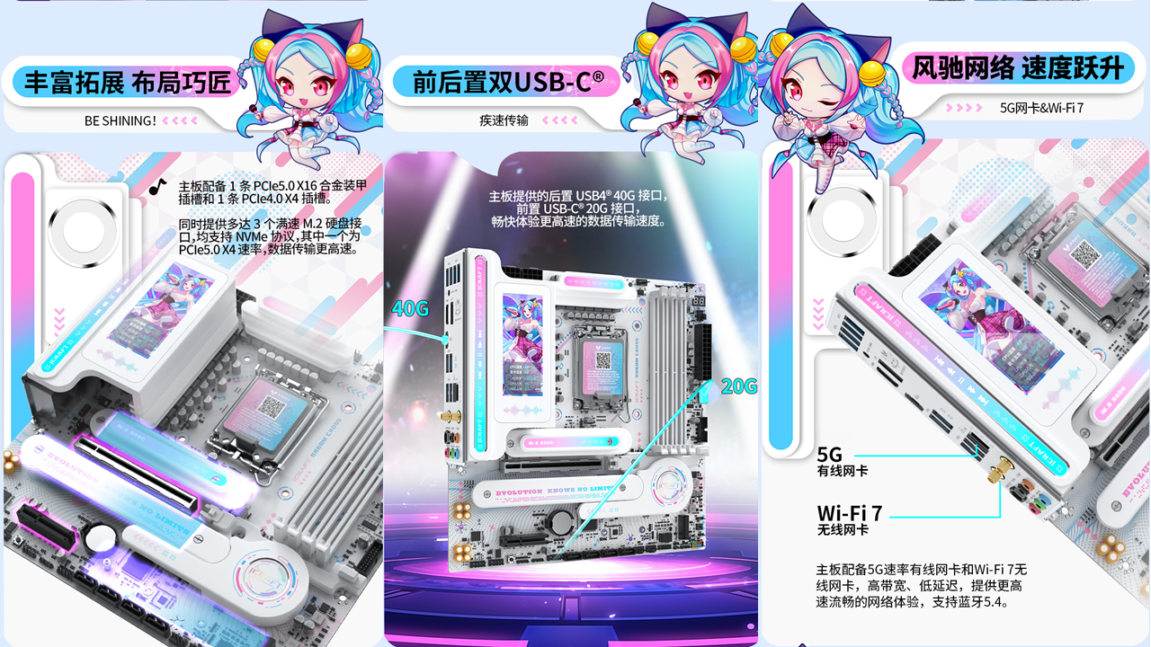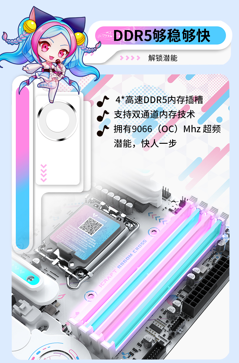 銘瑄 iCraft B860M CROSS PRO主板憑借二次元美學設計、強悍的供電性能、出色的內存潛力、豐富的拓展接口、穩定的網絡連接、便捷的操作體驗和個性化的燈光效果,成為英特爾酷睿Ultra 200S Plus系列處理器的新芯性能搭檔,更是打造個性化主機玩家的裝機優選。3 月 26 日新處理器正式開售,選擇銘瑄 iCraft B860M CROSS PRO主板,讓你在打造高顏值個性化主機的同時,輕松解鎖新芯滿幀戰力,從容迎戰游戲、創作、辦公等各類使用場景,開啟顏值與性能雙在線的硬件全新體驗!