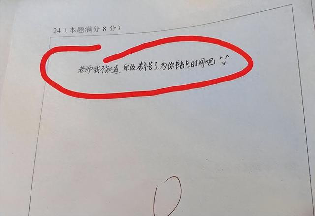 竟然直接写了一句非常有礼貌的话:“老师,我不知道,耽误您时间了,还嘴甜地说上您辛苦了。”结果没想到批卷老师压根就不吃这一套,哪怕他辛苦写了这么一行字,最后还是给了他0分。